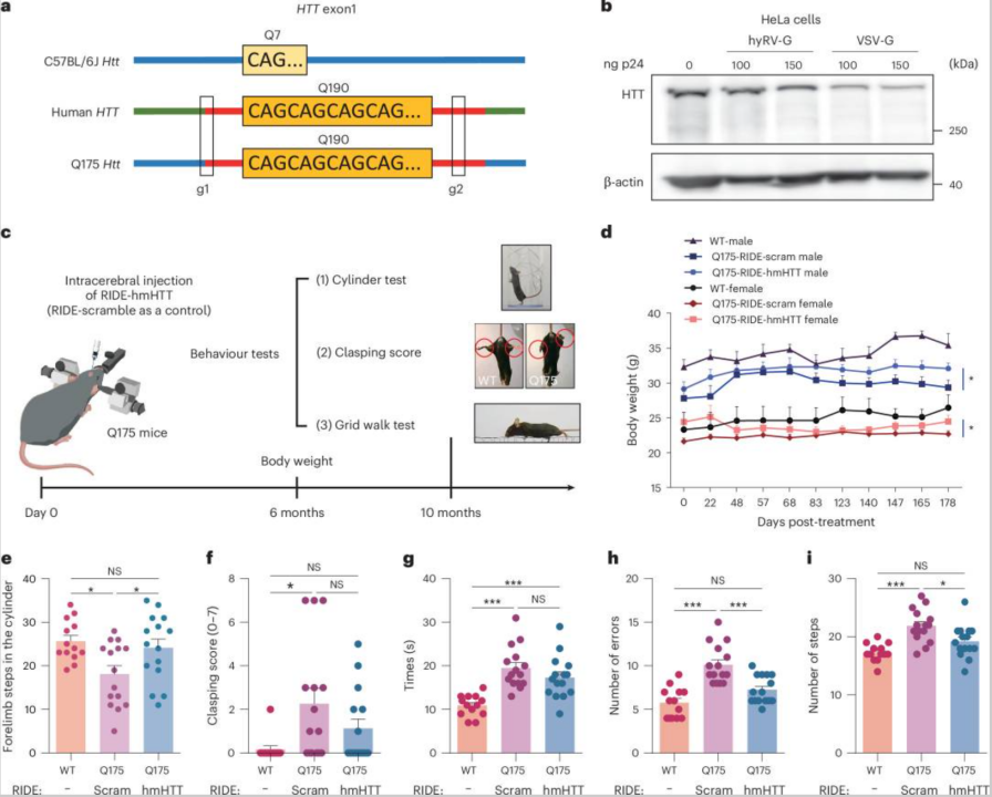 Furthermore, a team led by Cai Yujia at Shanghai Jiao Tong University, in collaboration with Fudan University and AstraZeneca, developed a novel gene editing delivery tool named RIDE (Ribonucleoprotein delivery). This technology utilizes virus-like particles (VLPs) to deliver ribonucleoprotein (RNP), enabling cell-specific gene editing in neuronal cells. In a mouse model of Huntington's disease, this approach significantly reduced mHTT expression and ameliorated disease symptoms by knocking out the CAG repeat sequence.