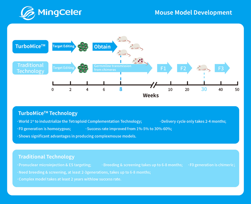 At Mingceler, we specialize in accelerating genetic research through our TurboMice™ technology, which harnesses optimized tetraploid complementation to deliver fully homozygous mouse models in just 2–4 months—60% faster than traditional breeding methods. Unlike conventional approaches that require 6–12 months of tedious breeding cycles, our process starts with precision editing of embryonic stem cells (ESCs) for targeted gene knockouts, floxing, or multi-locus modifications. We then use tetraploid complementation to develop these ESCs directly into experiment-ready mice, skipping the need for chimeric F1 and F2 generations. This method ensures 100% genotype certainty from the F0 generation, eliminating the guesswork of heterozygous screening and saving researchers thousands of hours spent on colony management.