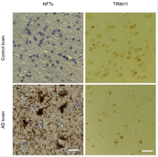 阿尔茨海默病患者tau 蛋白的神经原纤维缠结(NFT)增加, TRIM11蛋白降低。