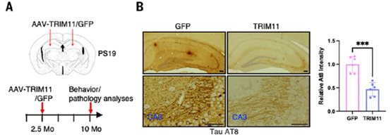 为了检查TRIM11在哺乳动物大脑中的作用并评估其治疗潜力,研究人员使用了多种tau病小鼠模型PS19小鼠和3×Tg-AD小鼠。