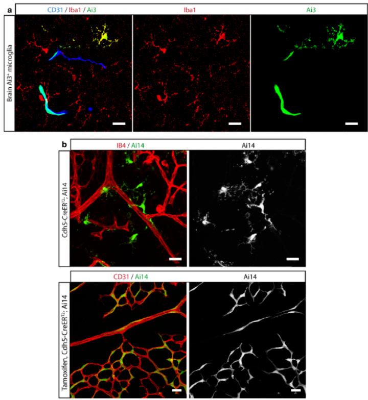 CreERT2系统的基底活性还可能对谱系追踪实验产生干扰。例如,在携带 Cdh5(PAC)-CreERT2(内皮细胞特异性)和 Ai14报告基因的小鼠大脑中,除了内皮细胞,还发现了一些被标记的小胶质细胞。已知Cdh5不在成熟小胶质细胞中表达,这暗示这些细胞可能是在发育早期(当其祖细胞短暂表达Cdh5时)被基底Cre活性标记的。如果没有设置严格的未诱导对照组,这一结果可能被错误地解释为内皮细胞向小胶质细胞的转分化。