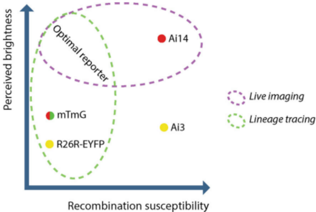 对于谱系追踪、嵌合体分析等要求高精准度的实验,应优先选择高重组阈值的报告基因,如 mTmG 或 R26R-EYFP,以最大程度减少背景标记。